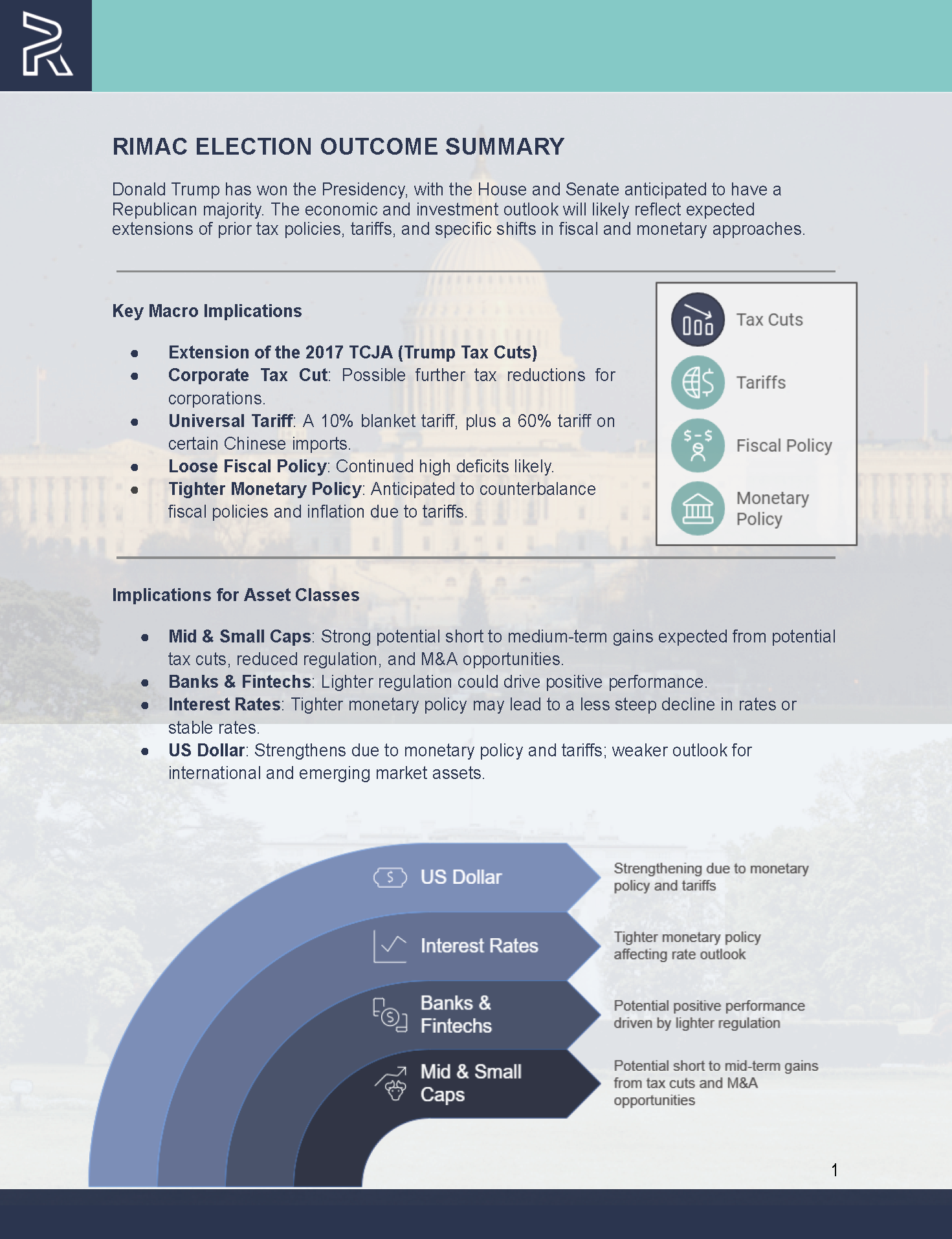 For financial advisors, this political shift presents both opportunities and risks. It may be an ideal time to evaluate client portfolios, especially in sectors sensitive to tax and regulatory changes. For clients with international holdings, considering hedging strategies against dollar appreciation might be prudent. Maintaining a diversified portfolio with selective exposure to mid and small-cap stocks, banking, and U.S.-centric investments could provide balanced growth potential and risk management.