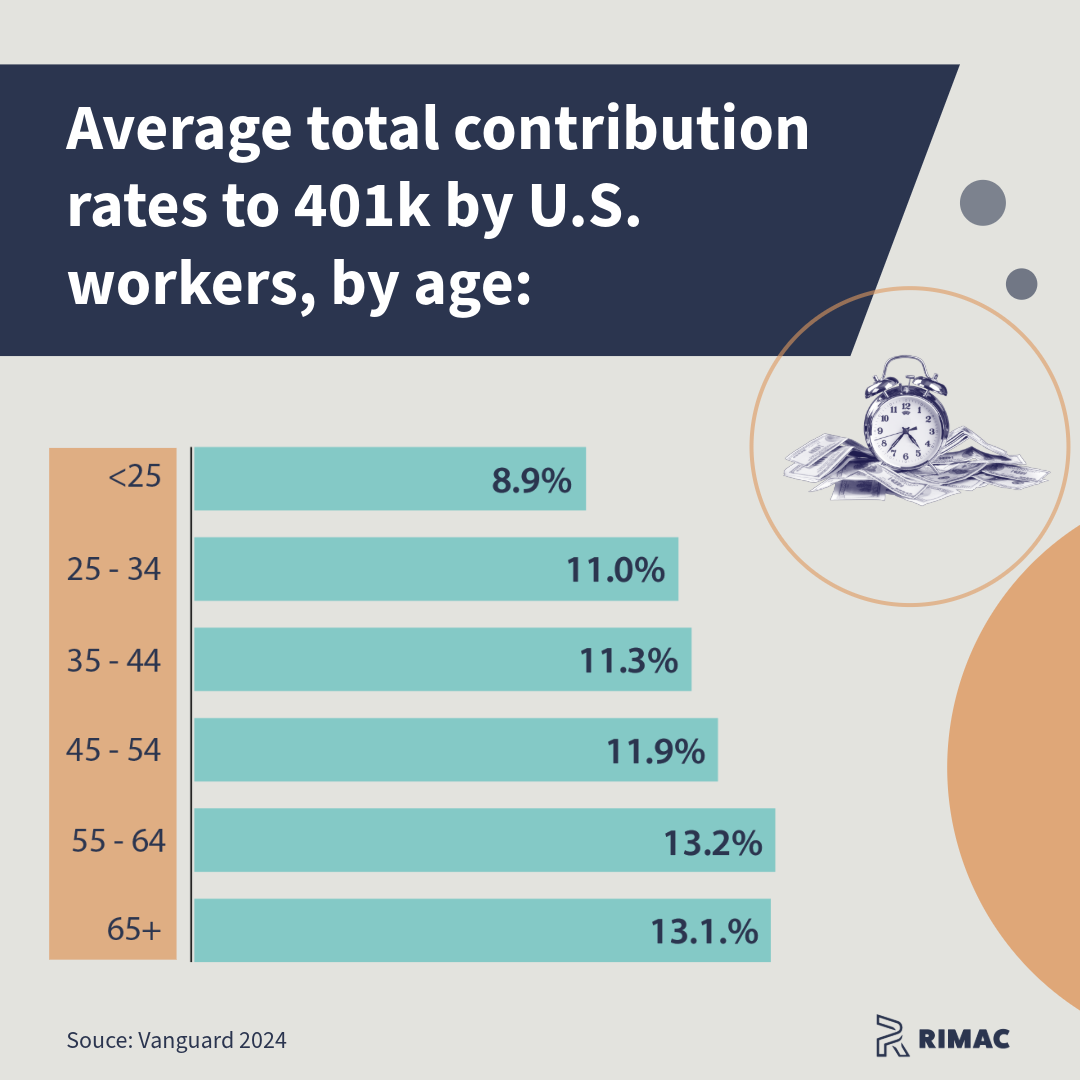 The report found that employees are contributing at record amounts into their 401ks of 7.4% in 2023, and when combined with employer contributions, the average participant total savings rate reached an all-time high of 11.7%. Take a look at the average retirement savings rate for investors at every age taking into account both employer and employee contributions: